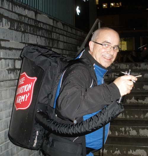 Major Everett Barrow (Territorial Corps Ministries Secretary) was busy distributing hot chocolate using one of these back-pack dispensers.