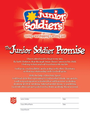 In re-writing this pledge we have considered the diversity of The Salvation Army in Canada and Bermuda, the language of our young people, the changes in family structure, the need to provide our young people with rationale, and a desire to stay true to our roots. The pledge, now called "The Junior Soldier Promise" has received input from across the territory and cabinet has approved the following: